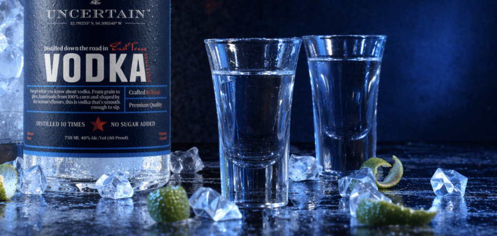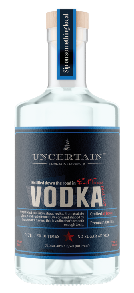 Our Vodka is the first release from the Uncertain line — distilled 10x from 100% East Texas corn and fermented in the open air. The result? A vodka so smooth and creamy you can sip it straight. No burn, no aftershock — just clean, crisp flavor shaped by the East Texas summer. It’s craft vodka that actually tastes like good.